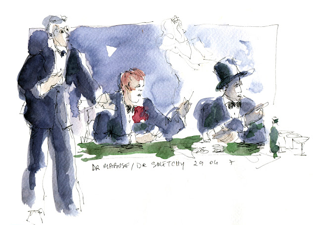 Docteur Sketchy est un atelier de dessin éphémère. Une occasion de dessiner des personnages costumés dans des lieux à chaque fois différents et en lien avec le thème. Cette fois-ci - grande première pour moi et accompagnée de Sophie - le thème était "le Docteur Mabuse" (film muet de Fritz Lang - 1922) au Cirque Electrique de la Porte des Lilas. Une ambiance de tripot de luxe berlinois sous la République de Weimar.Choisir dans les six ou sept acteurs, SA PAUSE. Impossible de tout dessiner. Changement toutes les 15 minutes.