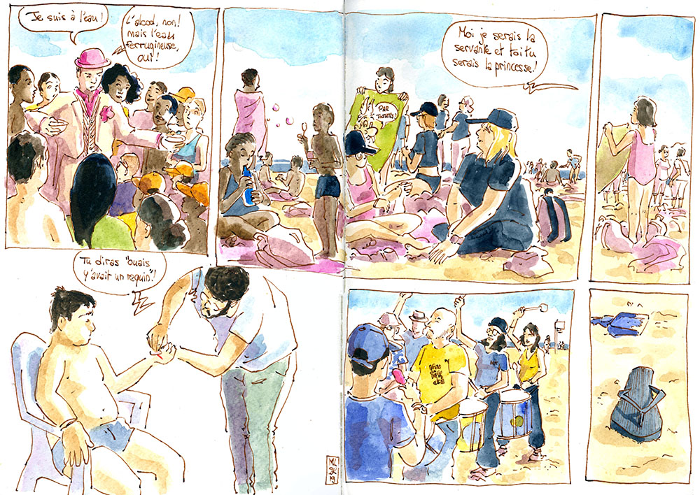 Avec Marion nous décidons d’aller croquer la baignade des Rouge. L’espace bain est archi sécurisé. Dans l’eau, avec des moniteurs en combinaisons et sur le sables avec des surveillants en gilets jaunes. Sans oublier l’équipe médicale en cas d’hypothermie. Et oui même si l’eau est froide les gamins n’arrivent pas à mesurer qu’à un moment il faut sortir. Leur plaisir est trop intense. Aux côtés de Marion, je tente un direct watercolor pour saisir cette foule de petits baigneurs qui s’agitent de bonheur dans tous les sens . La marée ne cesse de monter, pas facile de croquer au bord de l’eau. Marion, s’est faite bien avoir et se retrouve trempée. Mon croquis ne rend pas compte du nombre, ça grouille dans l’eau. Un workshop sketching people en mouvement me ferait du bien .