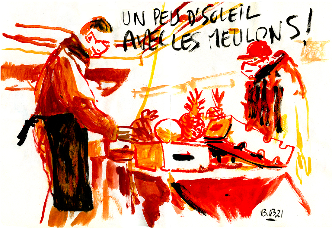 Chacun dessinait au marché proche de chez lui, certains jusque tard dans l’après-midi, et ce dans le respect des gestes barrières liées au Covid.